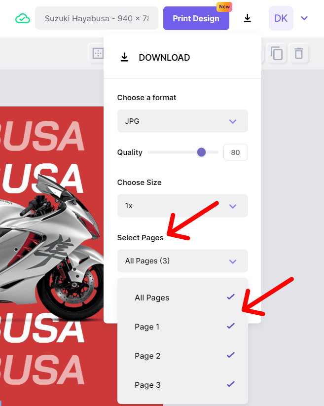 Note: You can export all the pages in a design or select a few ones from the list.